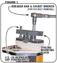 - Next insert the 1/2 – 20 Hex Head bolt that was removed during disassembly and mount tooling block [#10] in place securing it with (2) 5/8 – 18 x 3 SHCS. Torque them to 180 ft/lb.
