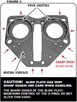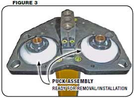 - Next apply thin coat of light lubricating oil to the puck cavities in the slide plate and insert the puck assemblies. See Figure 3.