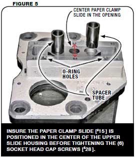 NOTE: Insert the two taper dowel pins that were removed from the housing. This will realign the upper slide housing to the slide plate. If no tapered pins were removed make sure that the upper slide housing is centered to the paper clamp slide before tightening the (6) SHCS [#28]. See Figure 5.